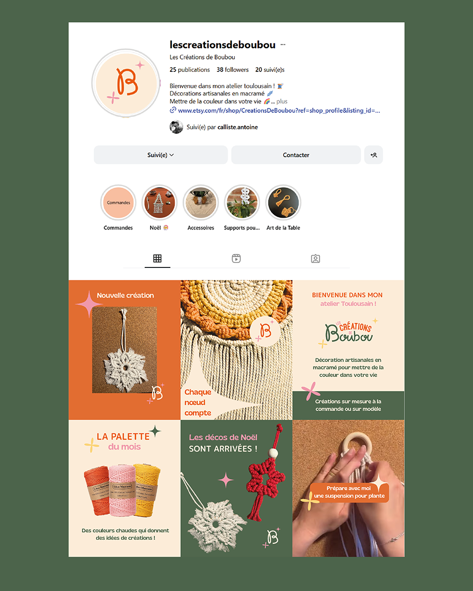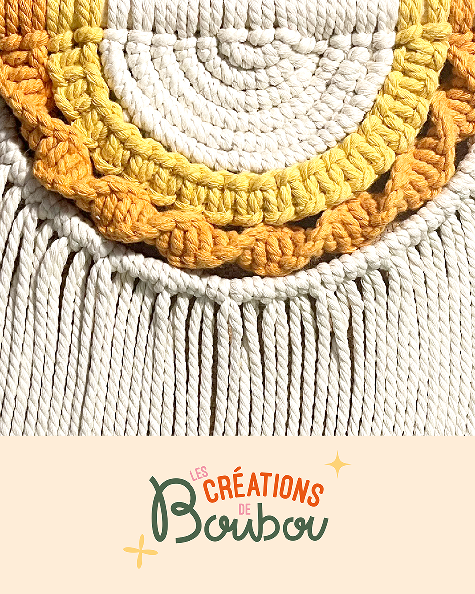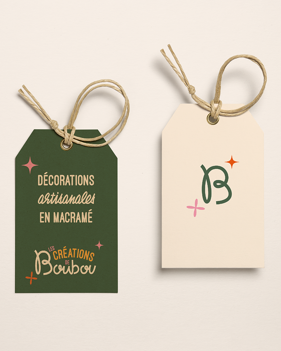 Brief : Concevoir l’identité visuelle de Les Créations de Boubou, une marque de macramé née de la volonté d’une jeune maman de créer un univers artisanal tout en passant plus de temps avec son enfant. Contrairement aux codes traditionnels du macramé souvent dominés par des tons neutres, la marque se distingue par des créations colorées, vives et expressives.